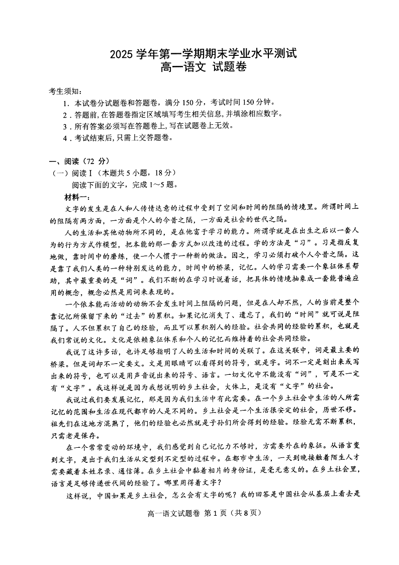 浙江省杭州市2025学年第一学期高一年级期末学业水平测试 语文.pdf