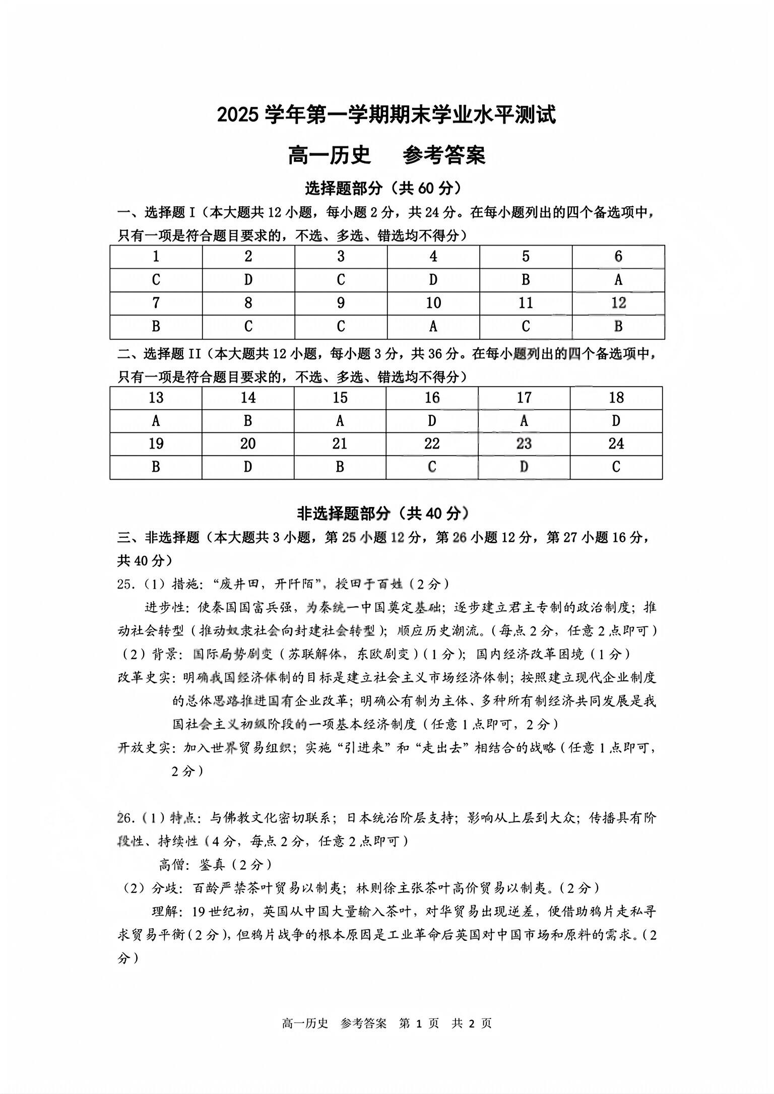 浙江省杭州市2025学年第一学期高一年级期末学业水平测试 历史答案.pdf