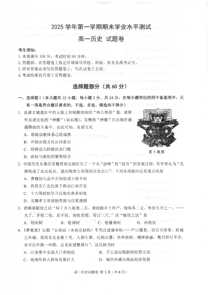 浙江省杭州市2025学年第一学期高一年级期末学业水平测试 历史.pdf