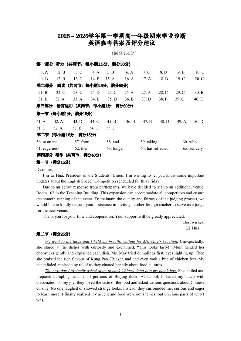 太原市2025-2026学年高一年级第一学期期末学业诊断 英语答案.pdf