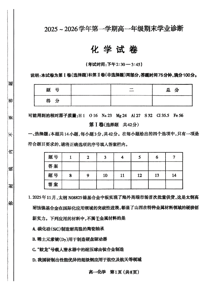太原市2025-2026学年高一年级第一学期期末学业诊断 化学.pdf