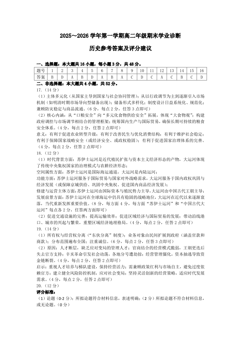 太原市2025-2026学年高二年级第一学期期末学业诊断 历史答案.pdf