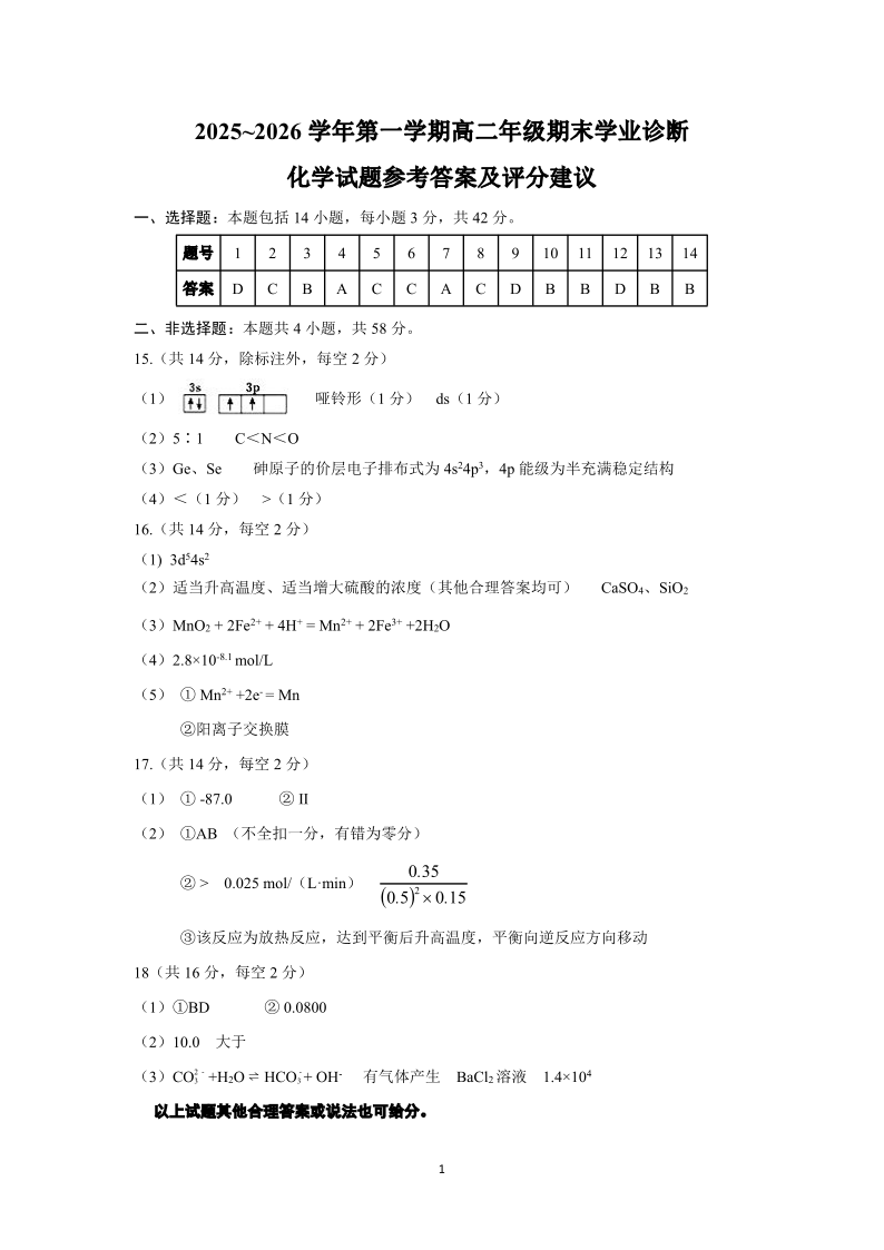 太原市2025-2026学年高二年级第一学期期末学业诊断 化学答案.pdf