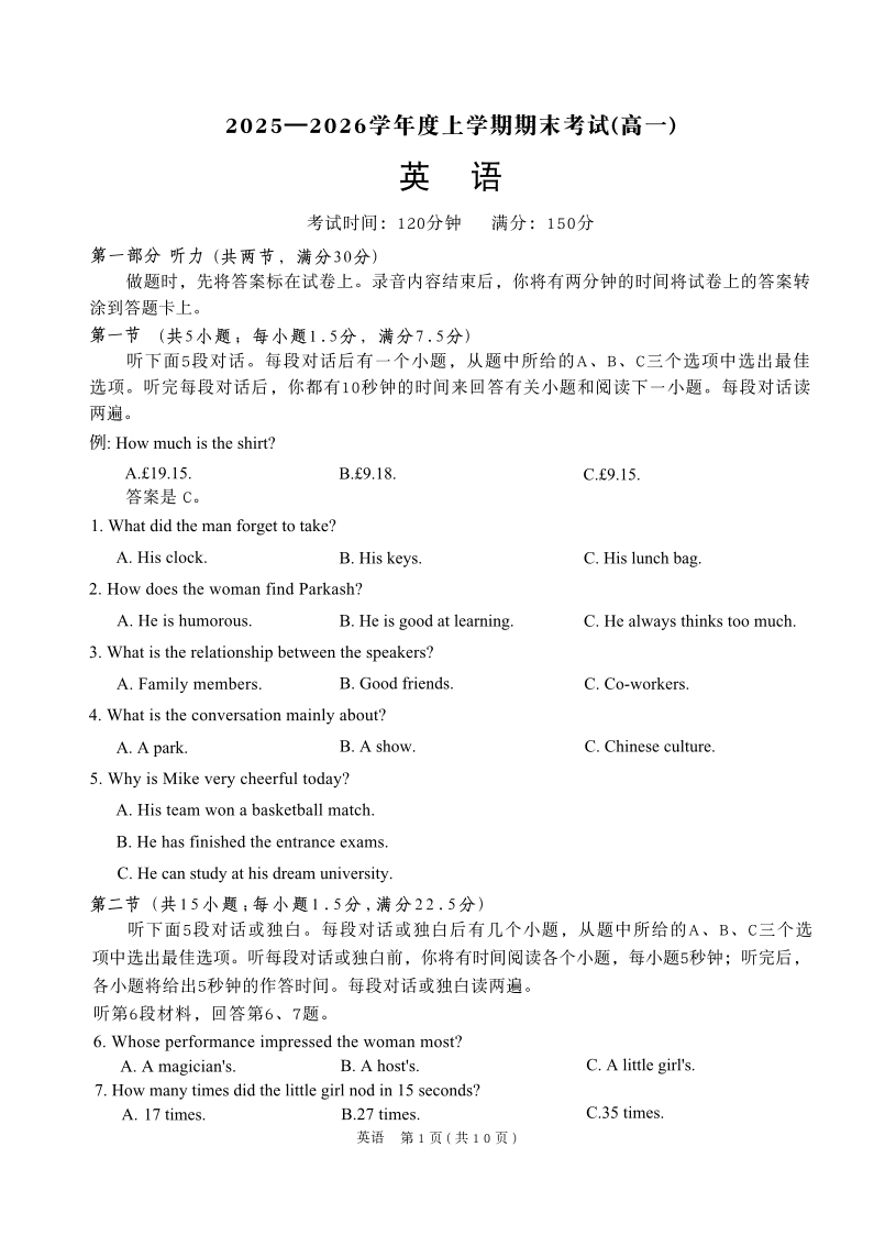 2026辽宁鞍山高一上学期1月期末 英语试题(含答案).pdf