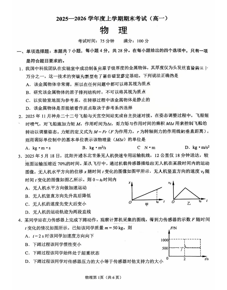 2026辽宁鞍山高一上学期1月期末 物理试题(含答案).pdf