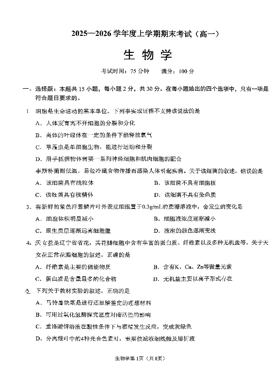 2026辽宁鞍山高一上学期1月期末 生物试题(含答案).pdf