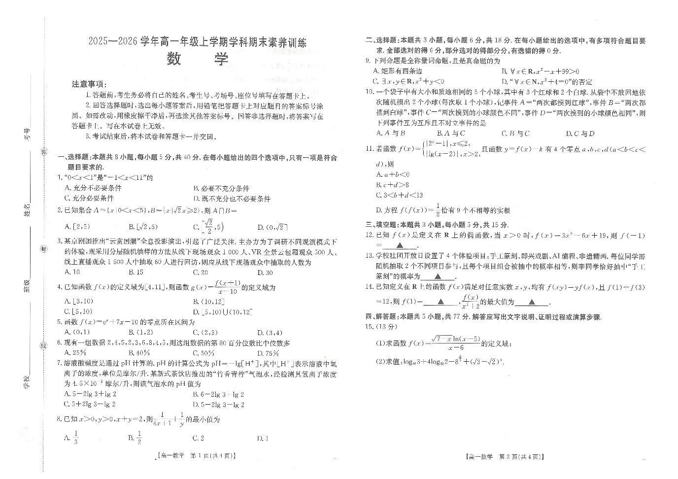 江西省2025一2026学年高一年级上学期学科期末素养训练 数学.pdf