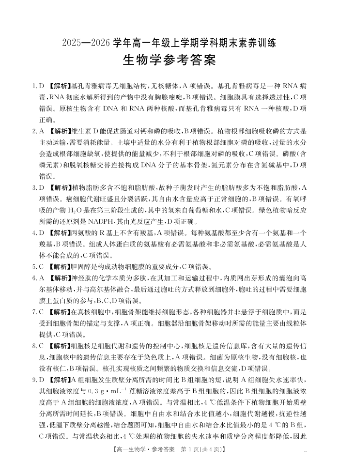 江西省2025一2026学年高一年级上学期学科期末素养训练 生物学答案.pdf