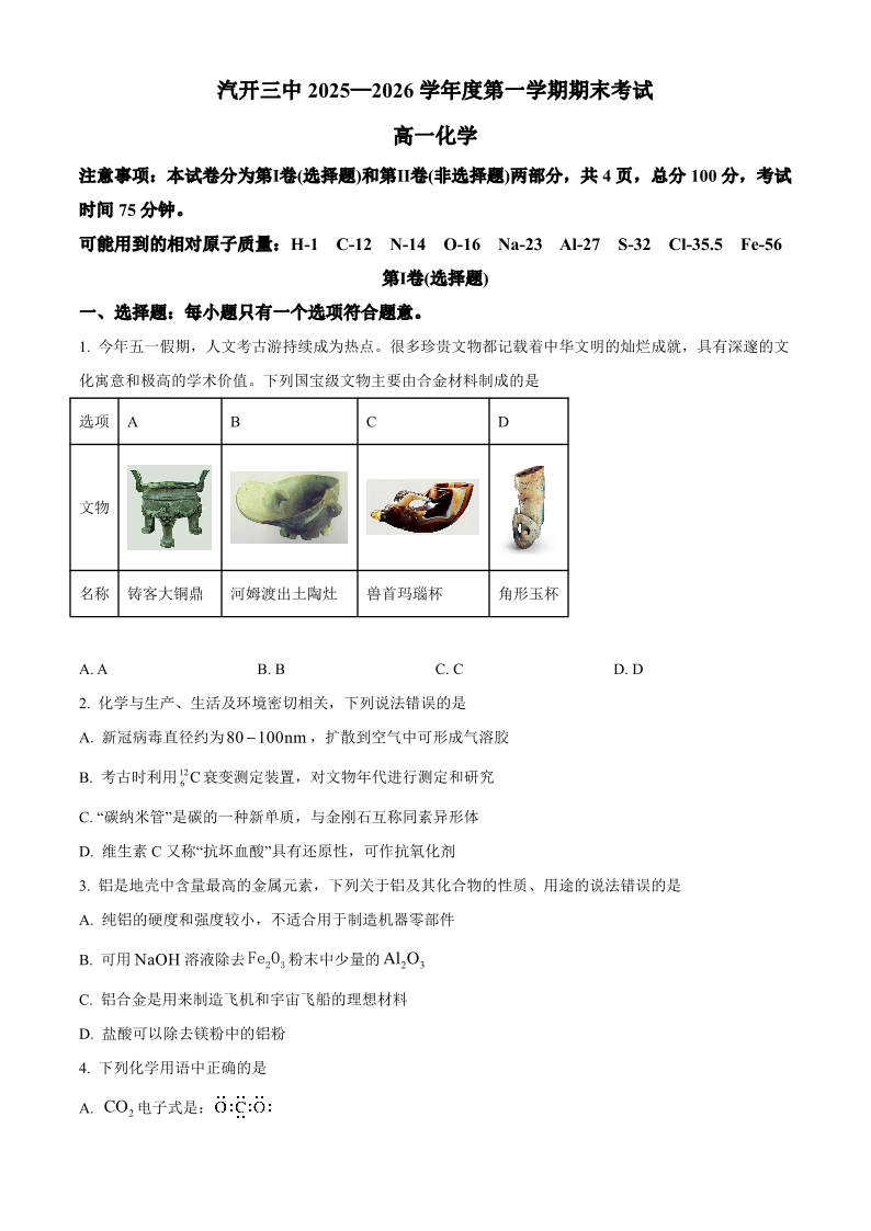 吉林省长春市长春汽开三中2025-2026学年高一上学期期末考试 化学试题(含答案).pdf