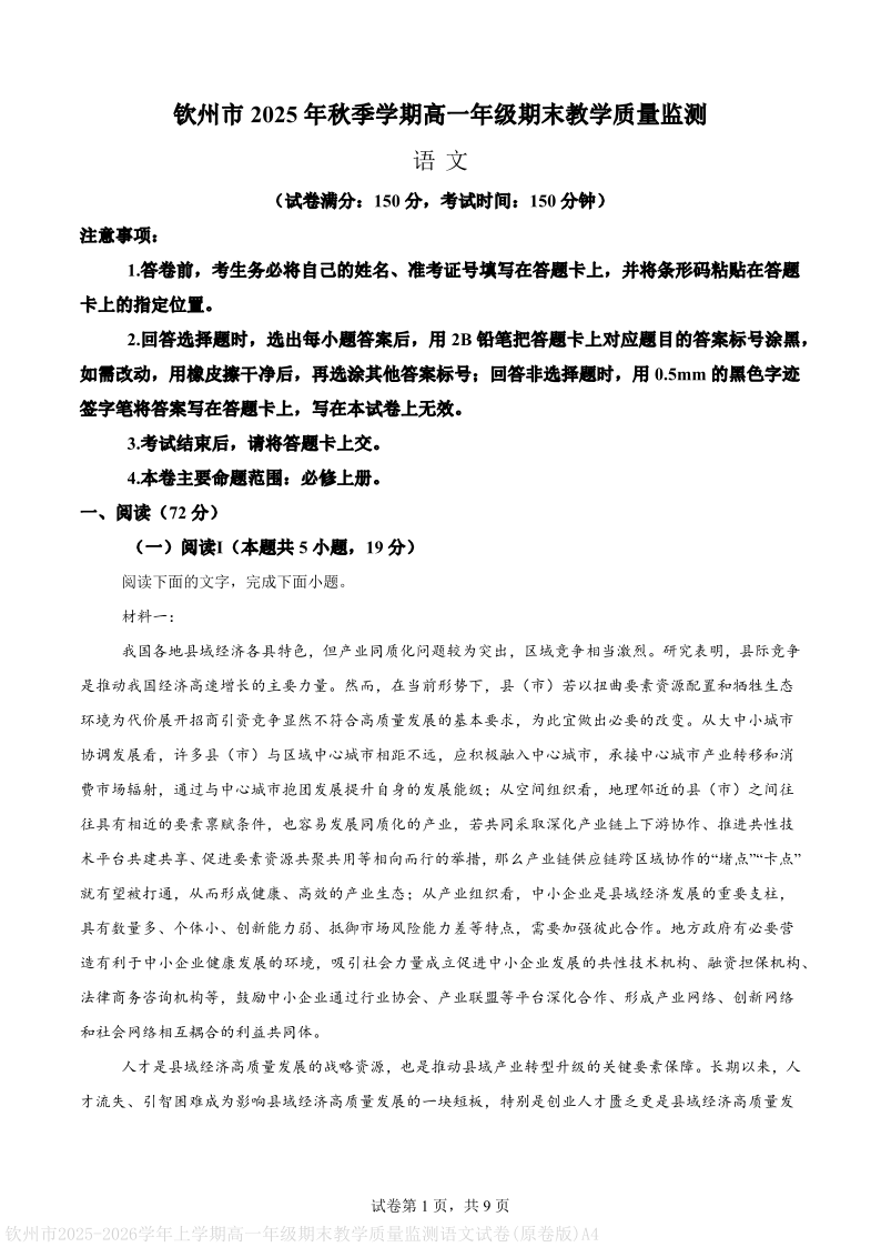 钦州市2025-2026高一上学期期末教学质量检测 语文.pdf