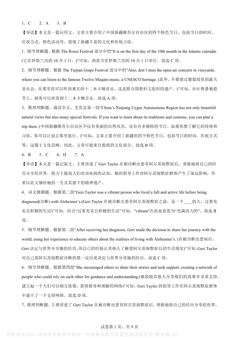钦州市2025-2026高一上学期期末教学质量检测 英语答案.pdf