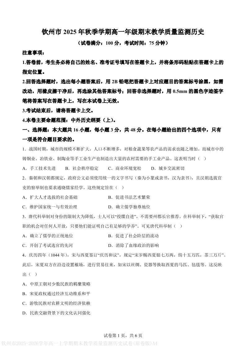 钦州市2025-2026高一上学期期末教学质量检测 历史.pdf