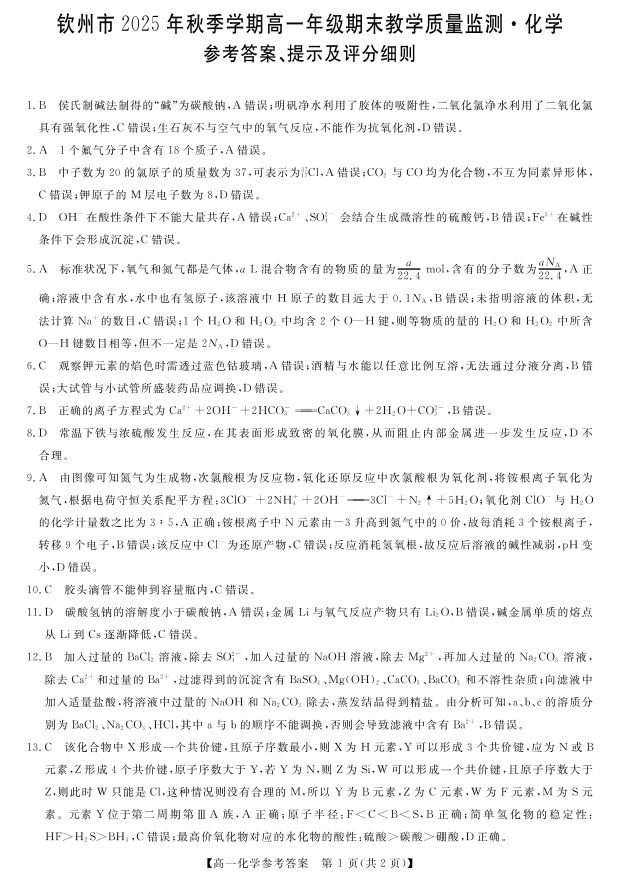 钦州市2025-2026高一上学期期末教学质量检测 化学答案.pdf