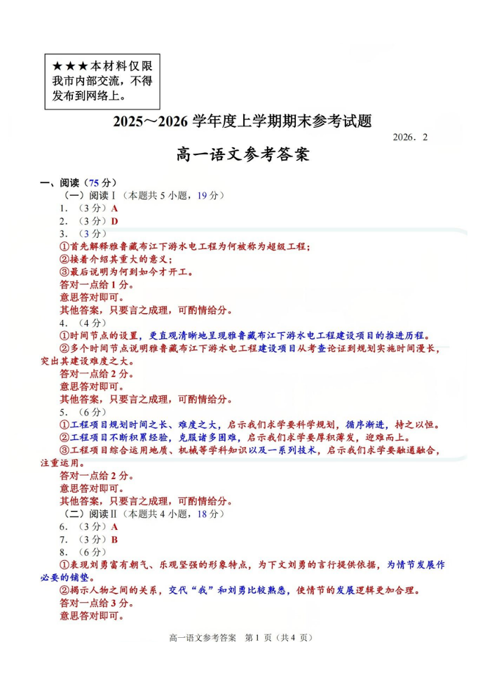 泉州市2025-2026学年度上学期高一年级期末考试 语文答案.pdf