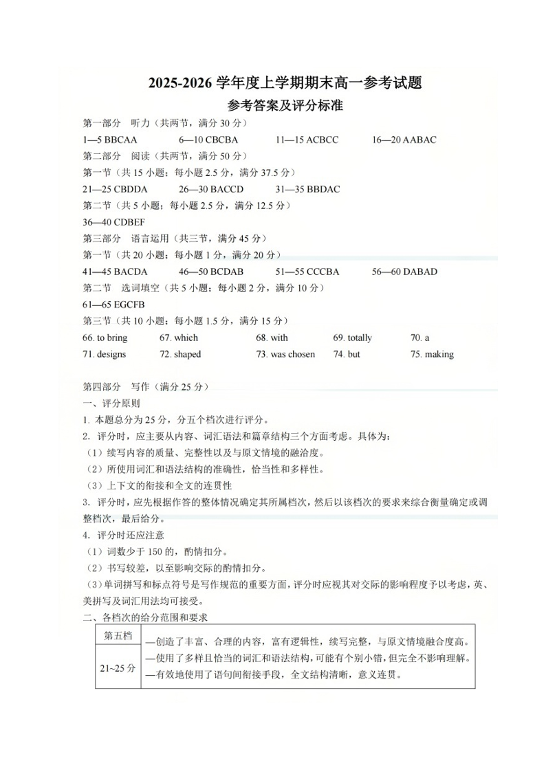 泉州市2025-2026学年度上学期高一年级期末考试 英语答案.pdf