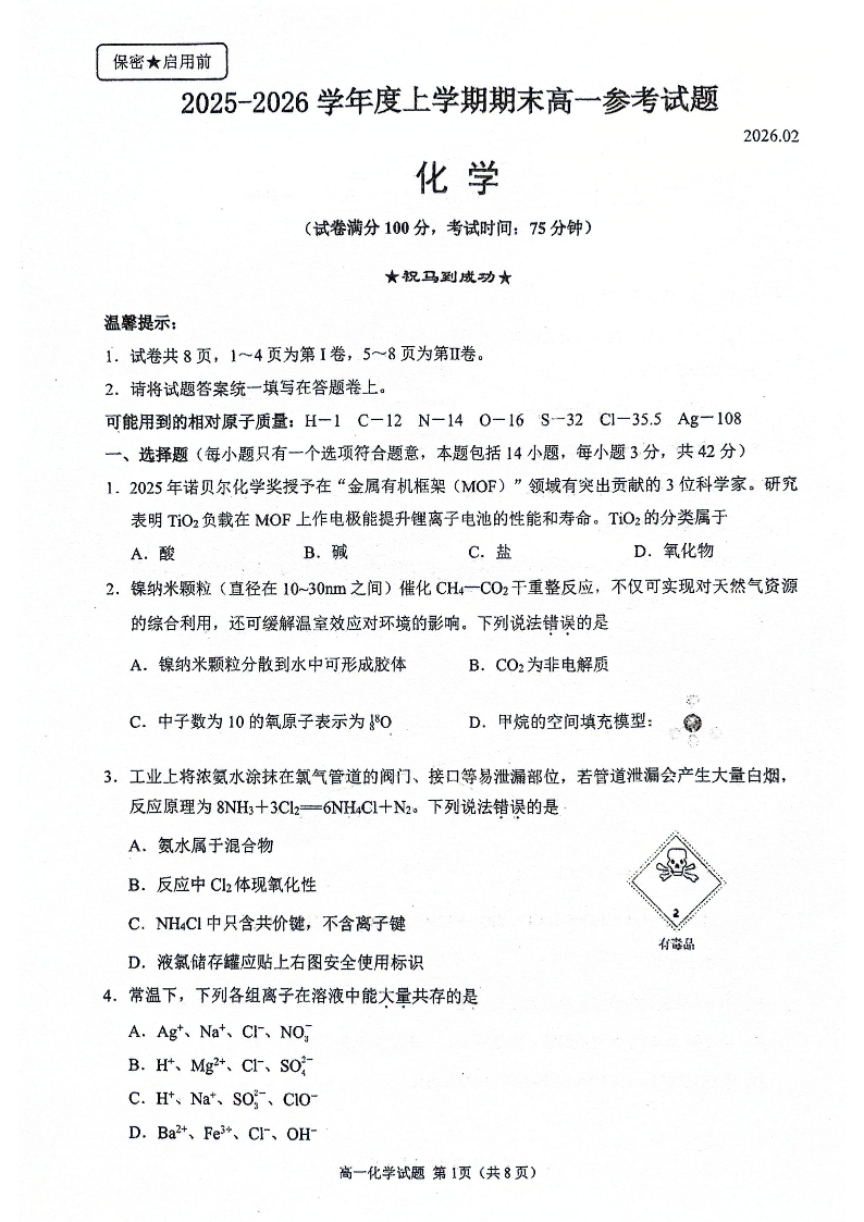 泉州市2025-2026学年度上学期高一年级期末考试 化学.pdf
