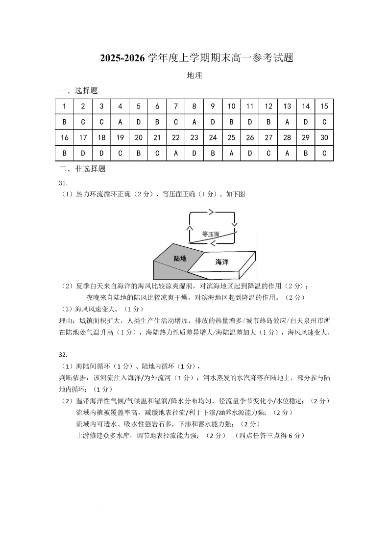 泉州市2025-2026学年度上学期高一年级期末考试 地理答案.pdf