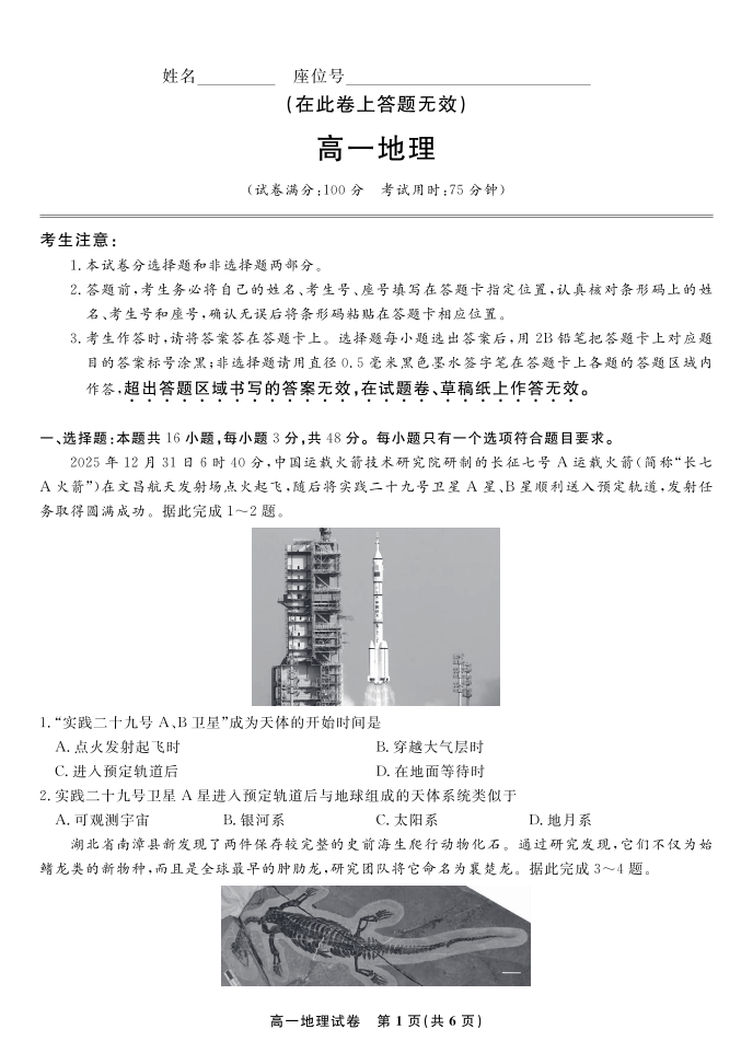 地理试题·安徽省皖江名校联盟2025-2026学年上学期高一期末考试.pdf