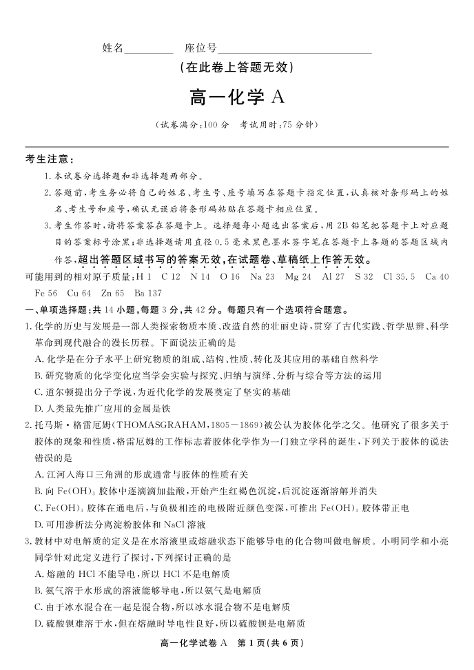 化学试题A·安徽省皖江名校联盟2025-2026学年上学期高一期末考试.pdf