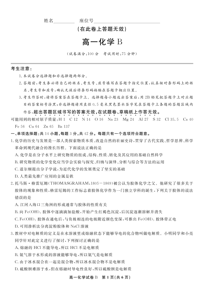 化学试题B·安徽省皖江名校联盟2025-2026学年上学期高一期末考试.pdf