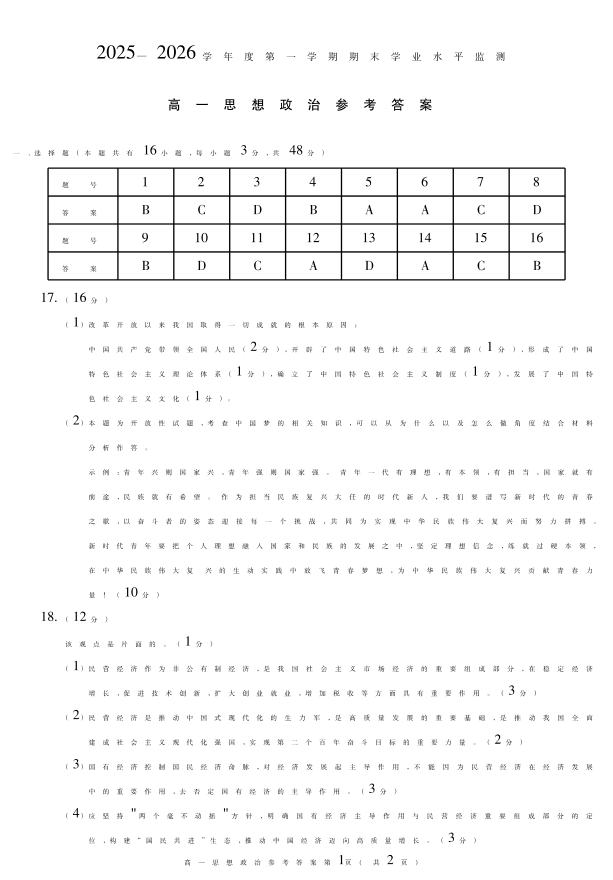 蚌埠市2025-2026学年度第一学期高一期末学业水平监测 政治答案.pdf