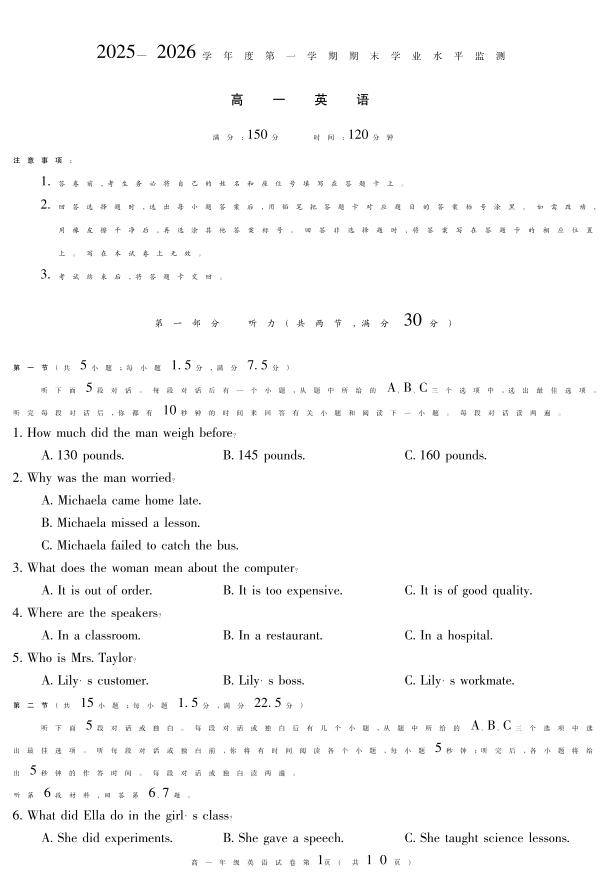 蚌埠市2025-2026学年度第一学期高一期末学业水平监测 英语.pdf