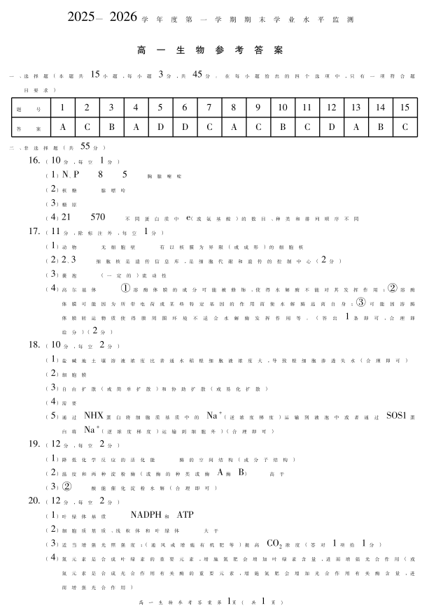 蚌埠市2025-2026学年度第一学期高一期末学业水平监测 生物答案.pdf