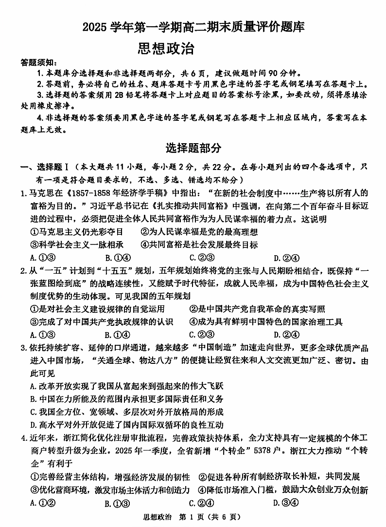 浙江省温州市2025学年第一学期高二年级期末质量评价题库(B类)政治.pdf