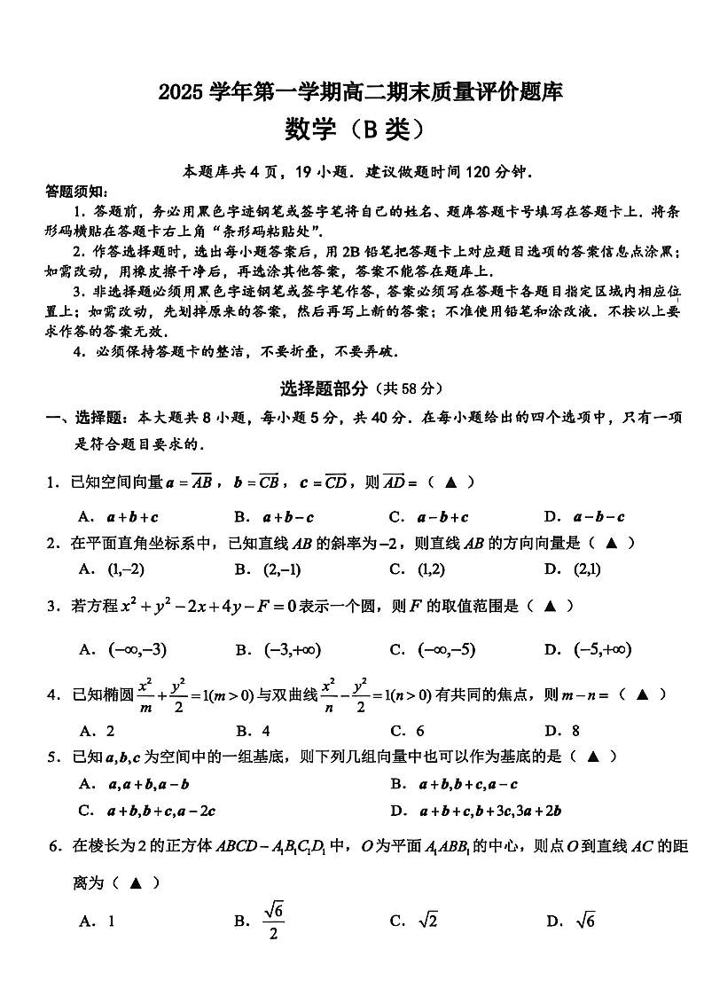 浙江省温州市2025学年第一学期高二年级期末质量评价题库(B类)数学.pdf