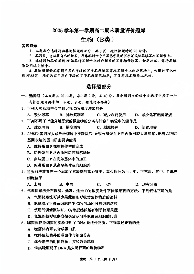 浙江省温州市2025学年第一学期高二年级期末质量评价题库(B类)生物.pdf