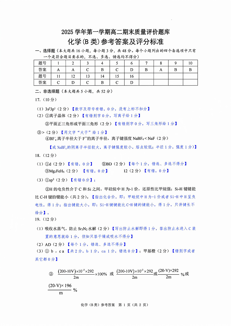 浙江省温州市2025学年第一学期高二年级期末质量评价题库(B类)化学答案.pdf