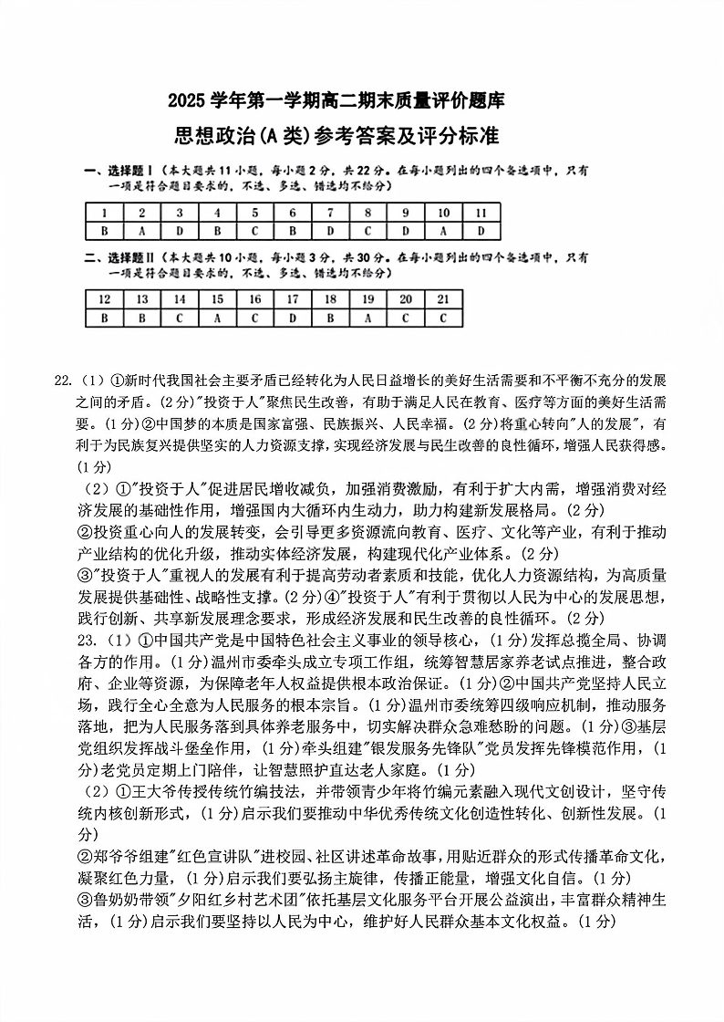 浙江省温州市2025学年第一学期高二年级期末质量评价题库(A卷)政治答案.pdf