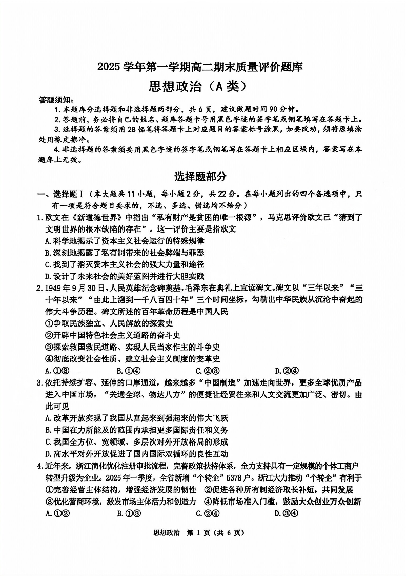 浙江省温州市2025学年第一学期高二年级期末质量评价题库(A卷)政治.pdf