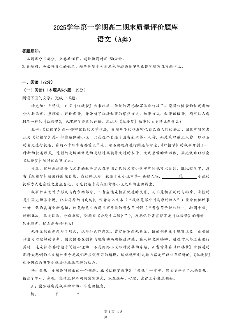浙江省温州市2025学年第一学期高二年级期末质量评价题库(A卷)语文.docx