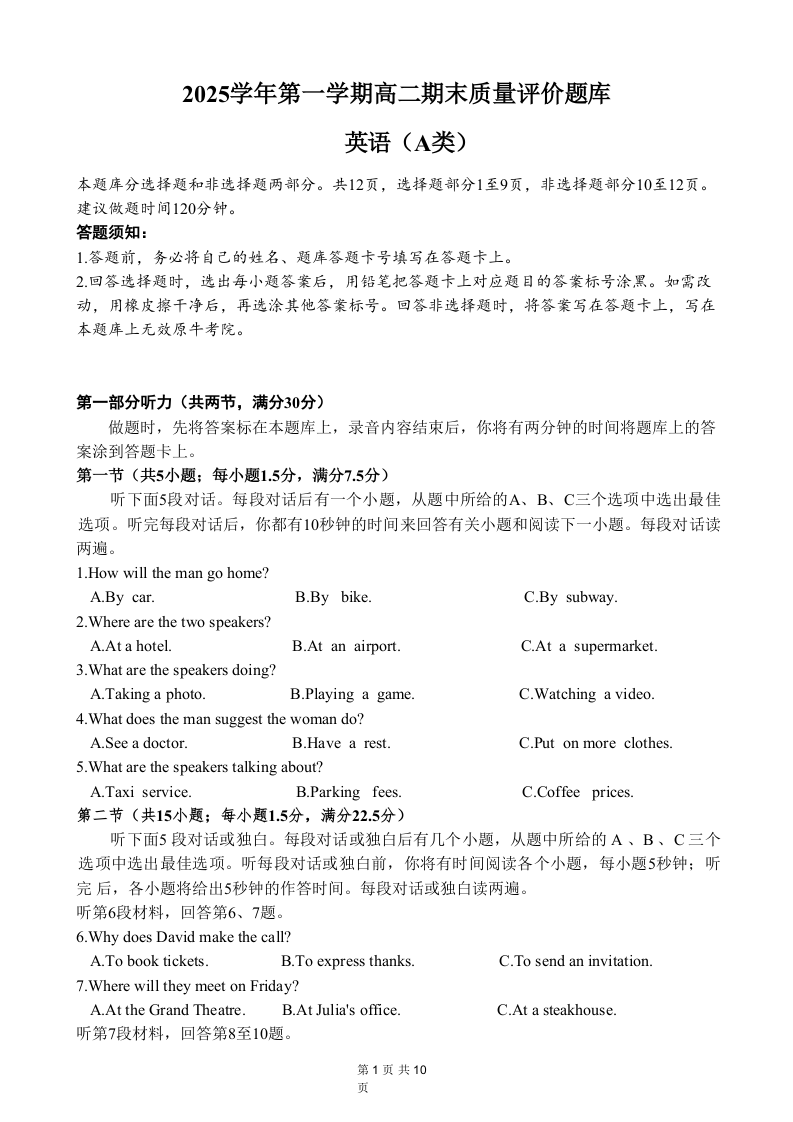 浙江省温州市2025学年第一学期高二年级期末质量评价题库(A卷)英语.docx