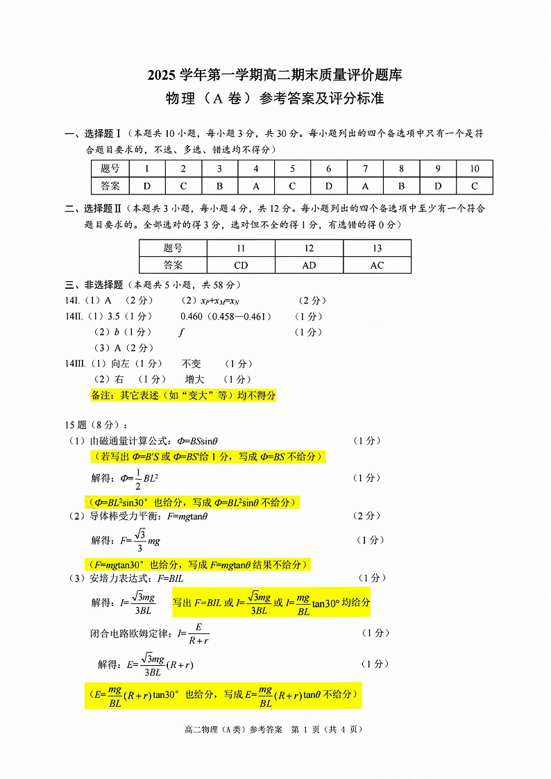 浙江省温州市2025学年第一学期高二年级期末质量评价题库(A卷)物理答案.pdf