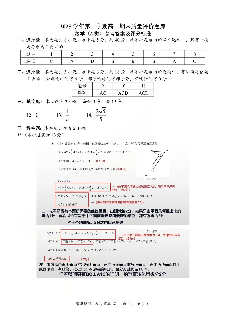 浙江省温州市2025学年第一学期高二年级期末质量评价题库(A卷)数学答案.pdf