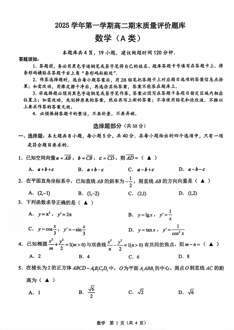 浙江省温州市2025学年第一学期高二年级期末质量评价题库(A卷)数学.pdf
