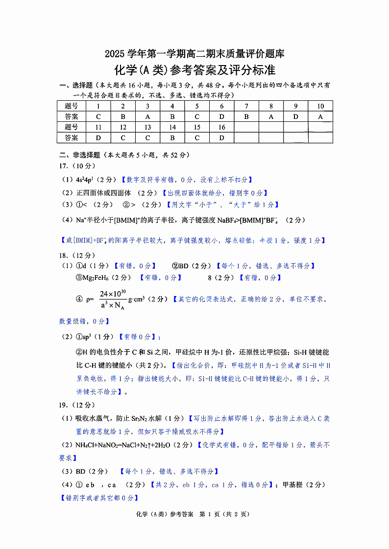 浙江省温州市2025学年第一学期高二年级期末质量评价题库(A卷)化学答案.pdf