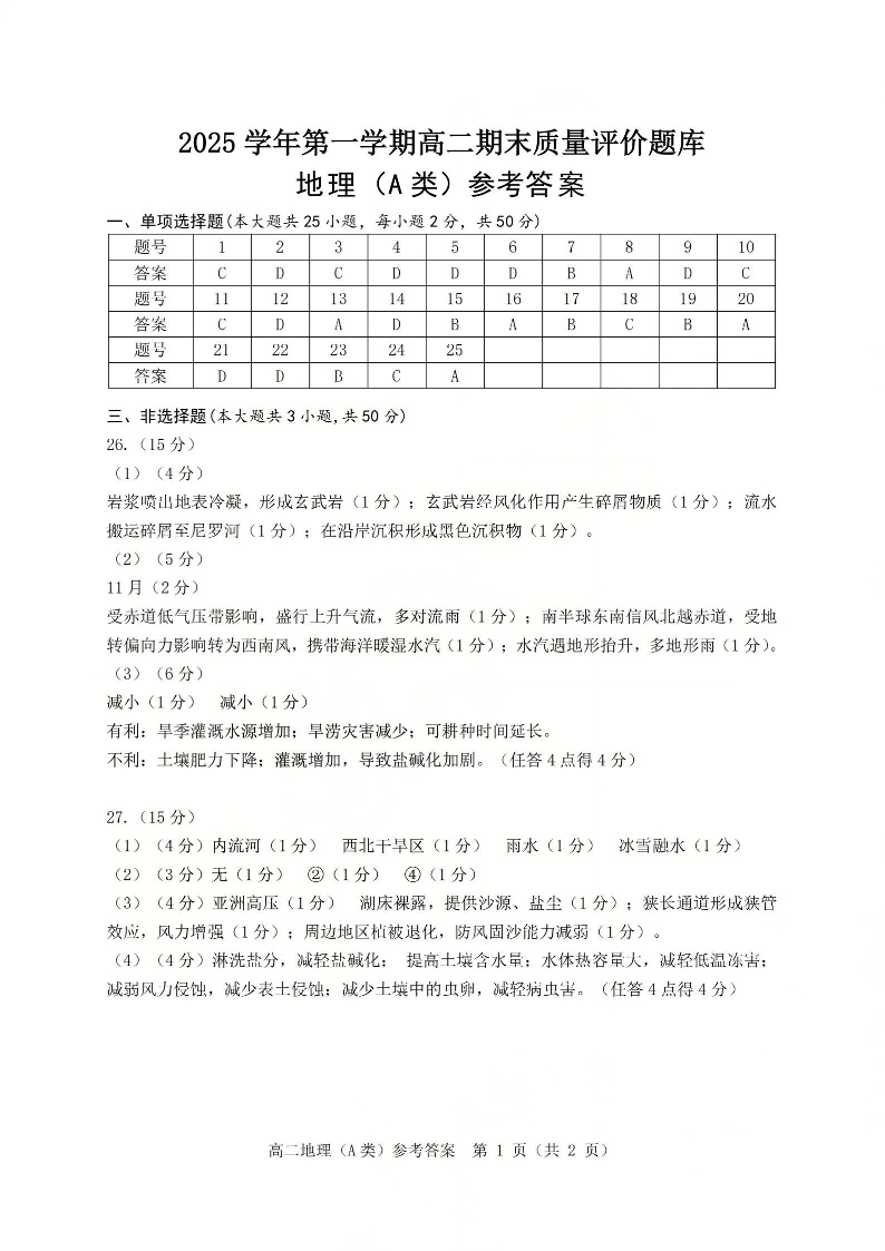 浙江省温州市2025学年第一学期高二年级期末质量评价题库(A卷)地理答案.pdf