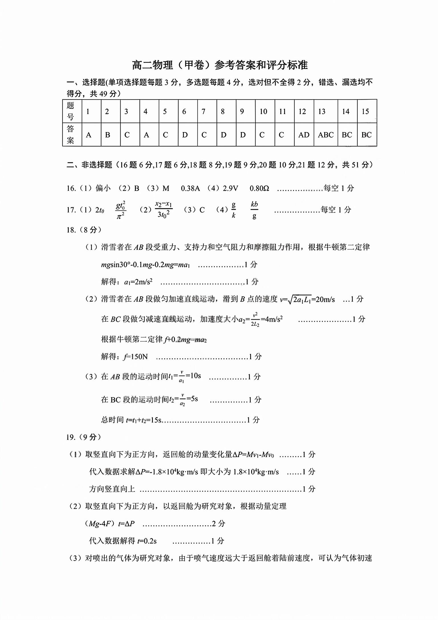 浙江省杭州市2025学年第一学期高二年级期末学业水平测试 物理(甲卷)答案.pdf
