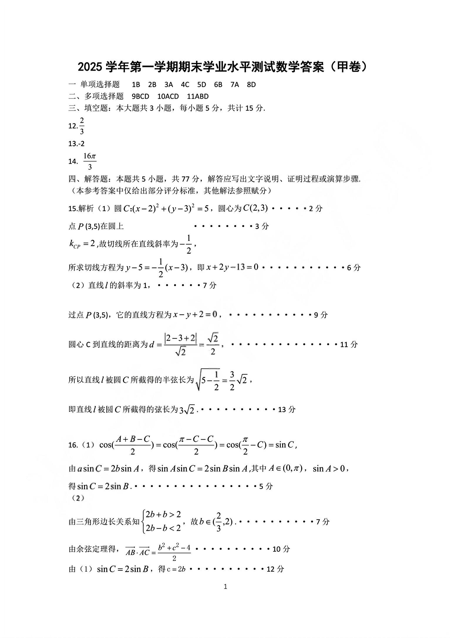 浙江省杭州市2025学年第一学期高二年级期末学业水平测试 数学(甲卷)答案.pdf