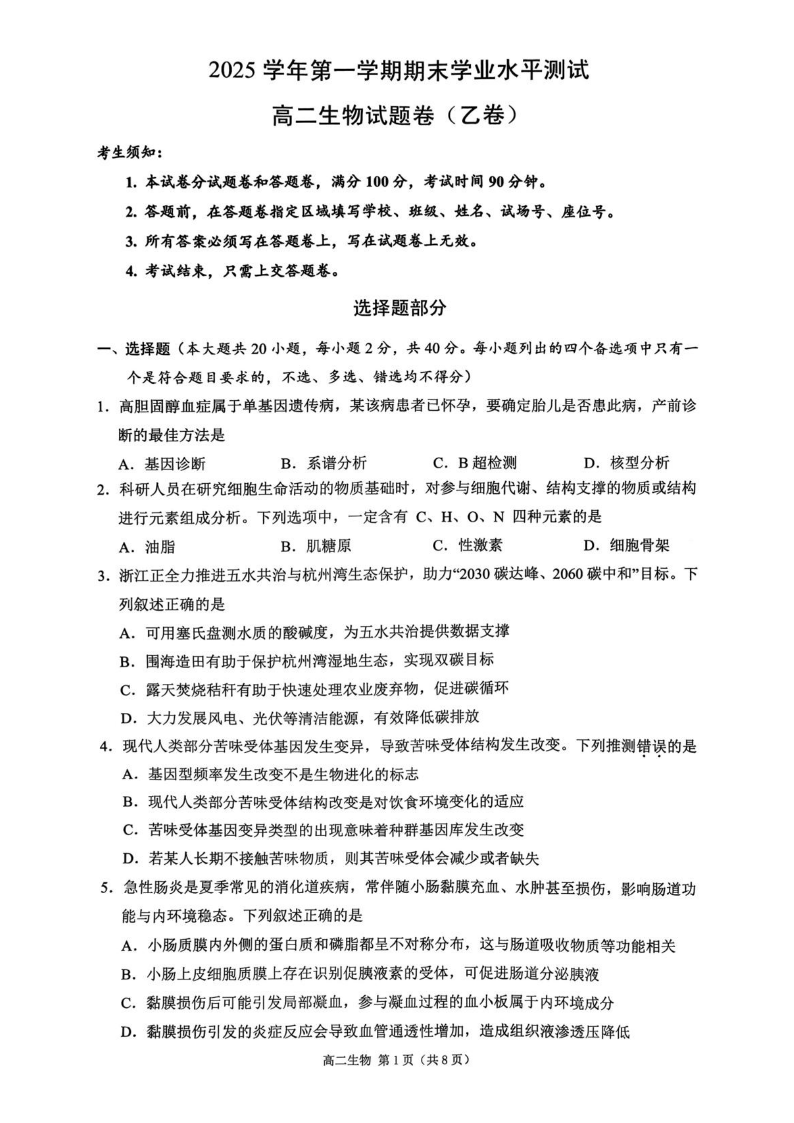 浙江省杭州市2025学年第一学期高二年级期末学业水平测试 生物(乙卷).pdf