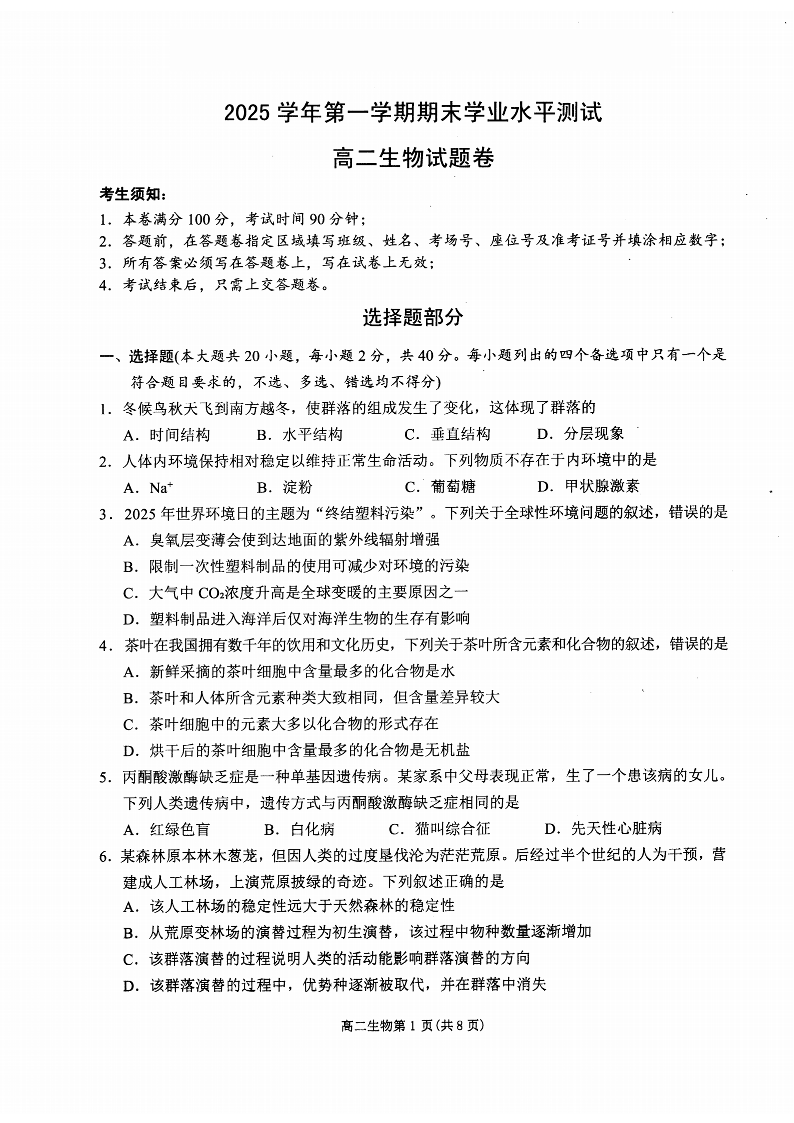 浙江省杭州市2025学年第一学期高二年级期末学业水平测试 生物(甲卷).pdf