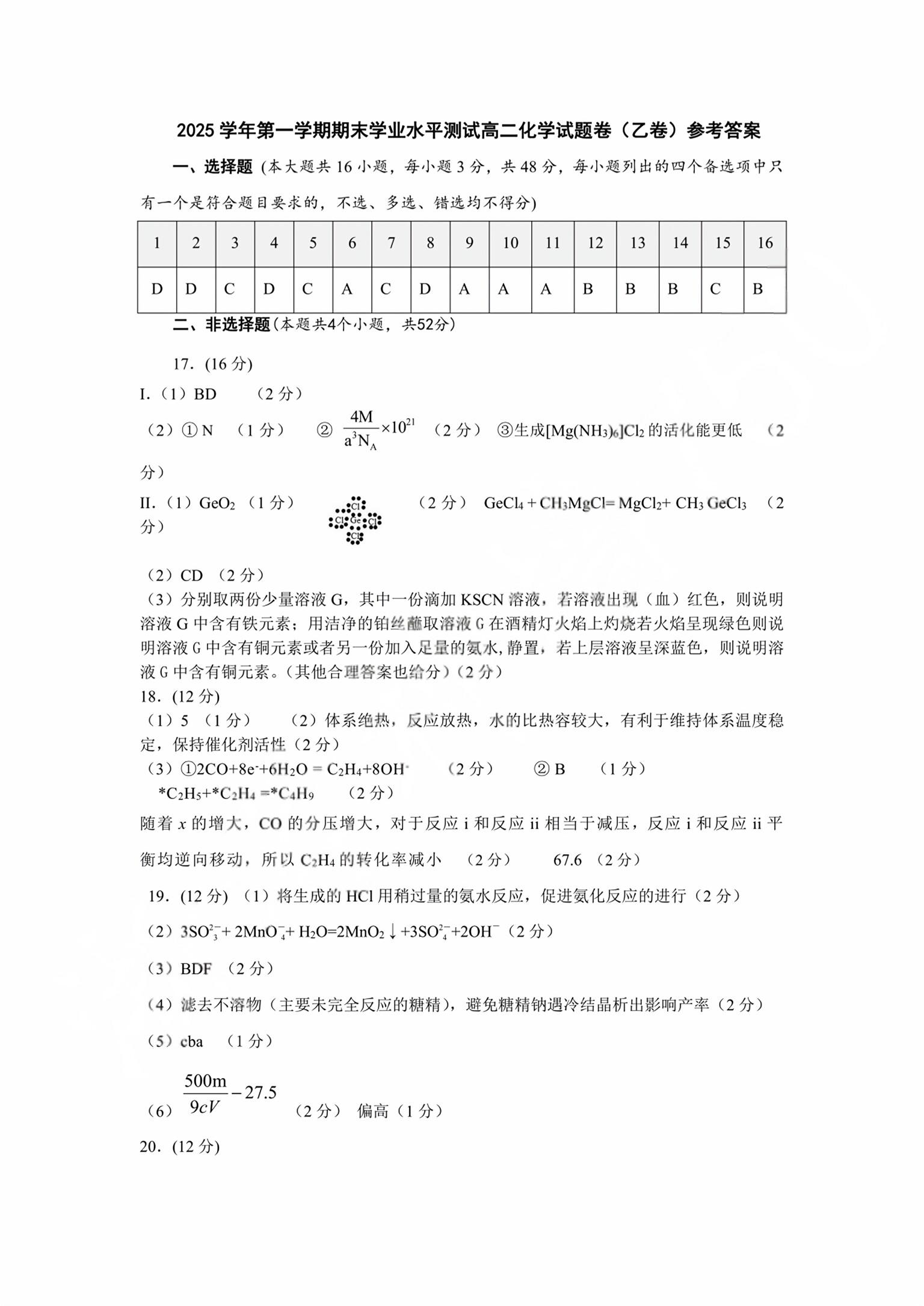 浙江省杭州市2025学年第一学期高二年级期末学业水平测试 化学(乙卷)答案.pdf