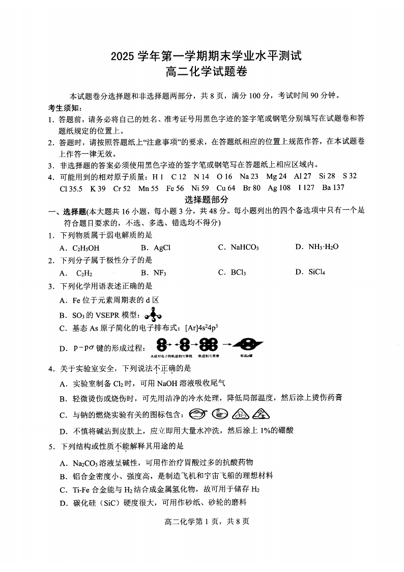 浙江省杭州市2025学年第一学期高二年级期末学业水平测试 化学(甲卷).pdf
