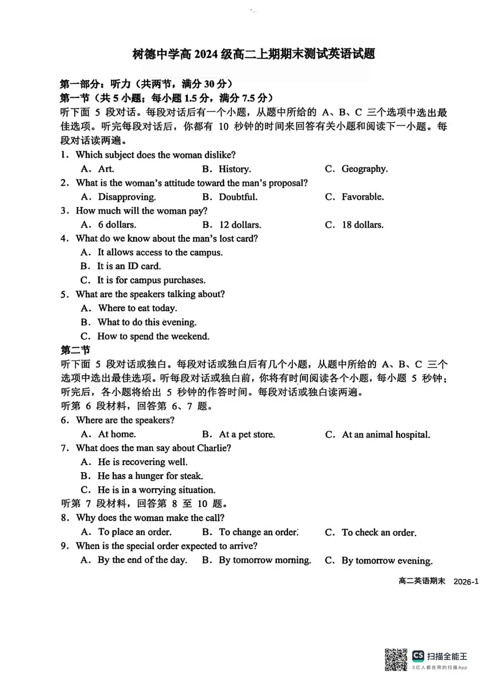 四川省成都市树德中学2025-2026学年高二上学期期末测试 英语试题(含答案).pdf