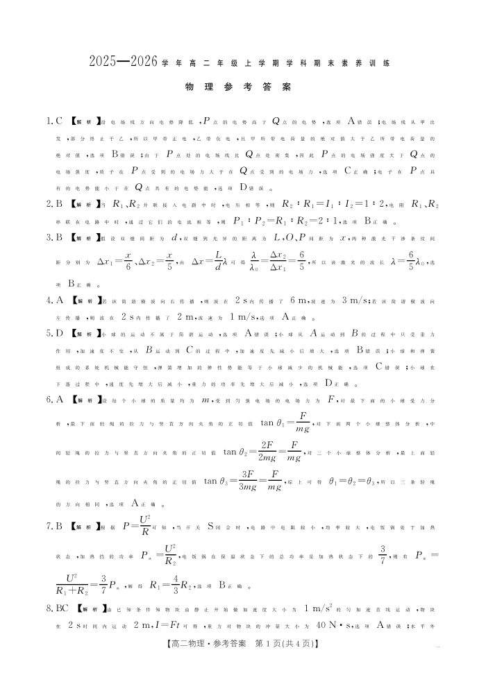 江西省2025一2026学年高二年级上学期学科期末素养训练 物理答案.pdf