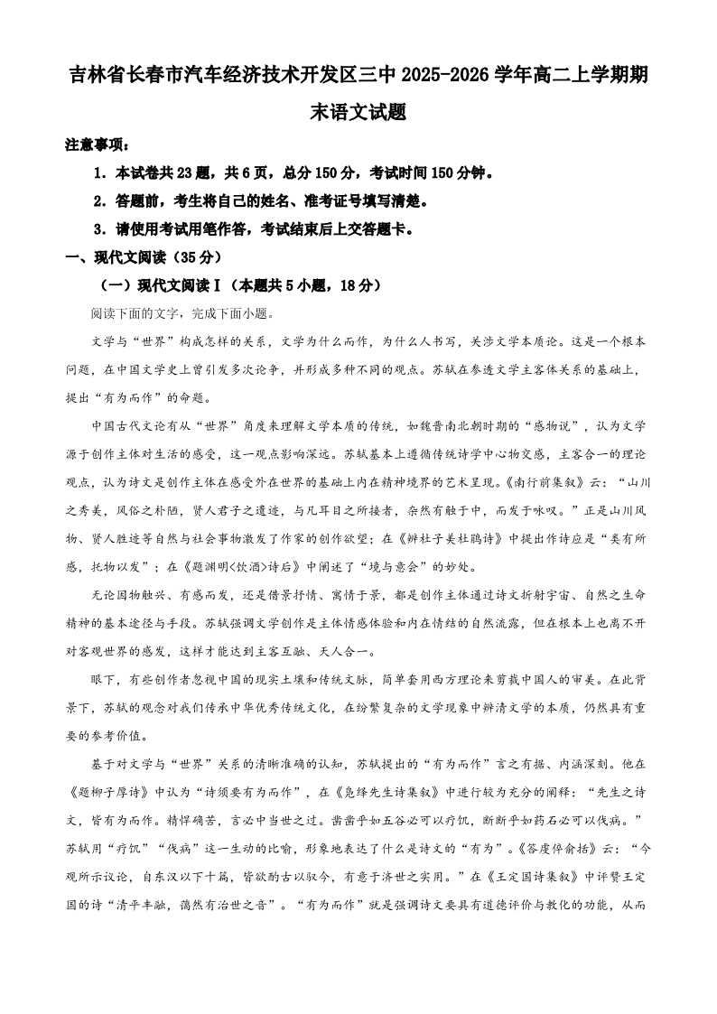 吉林省长春市长春汽开三中2025-2026学年高二上学期期末考试 语文试题(含答案).pdf