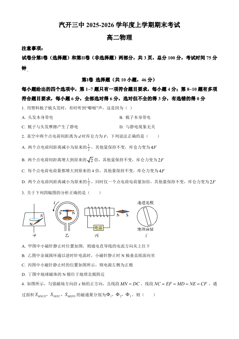 吉林省长春市长春汽开三中2025-2026学年高二上学期期末考试 物理试题(含答案).pdf
